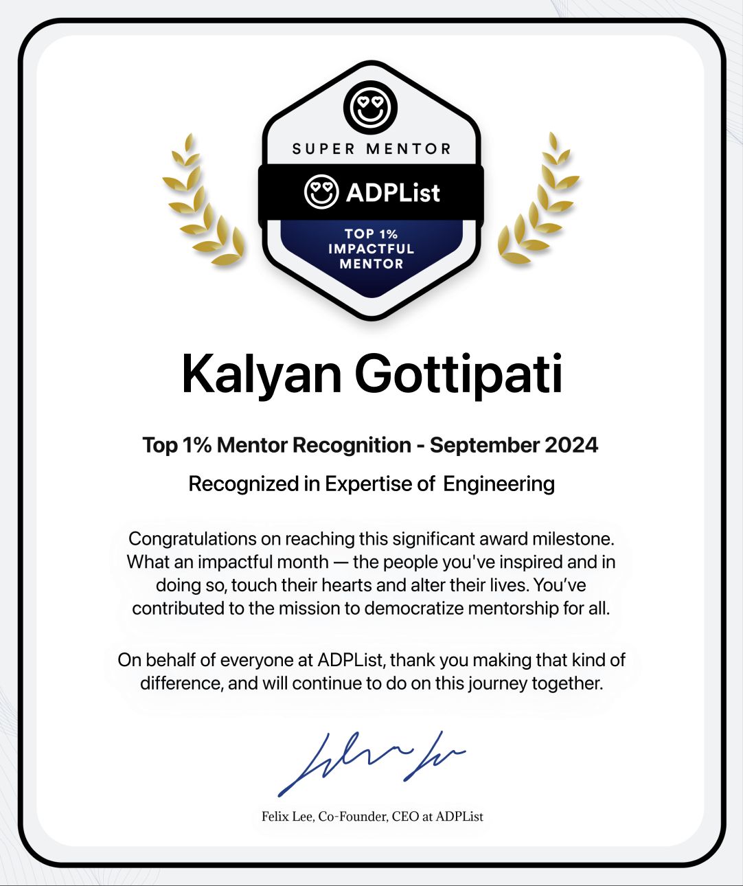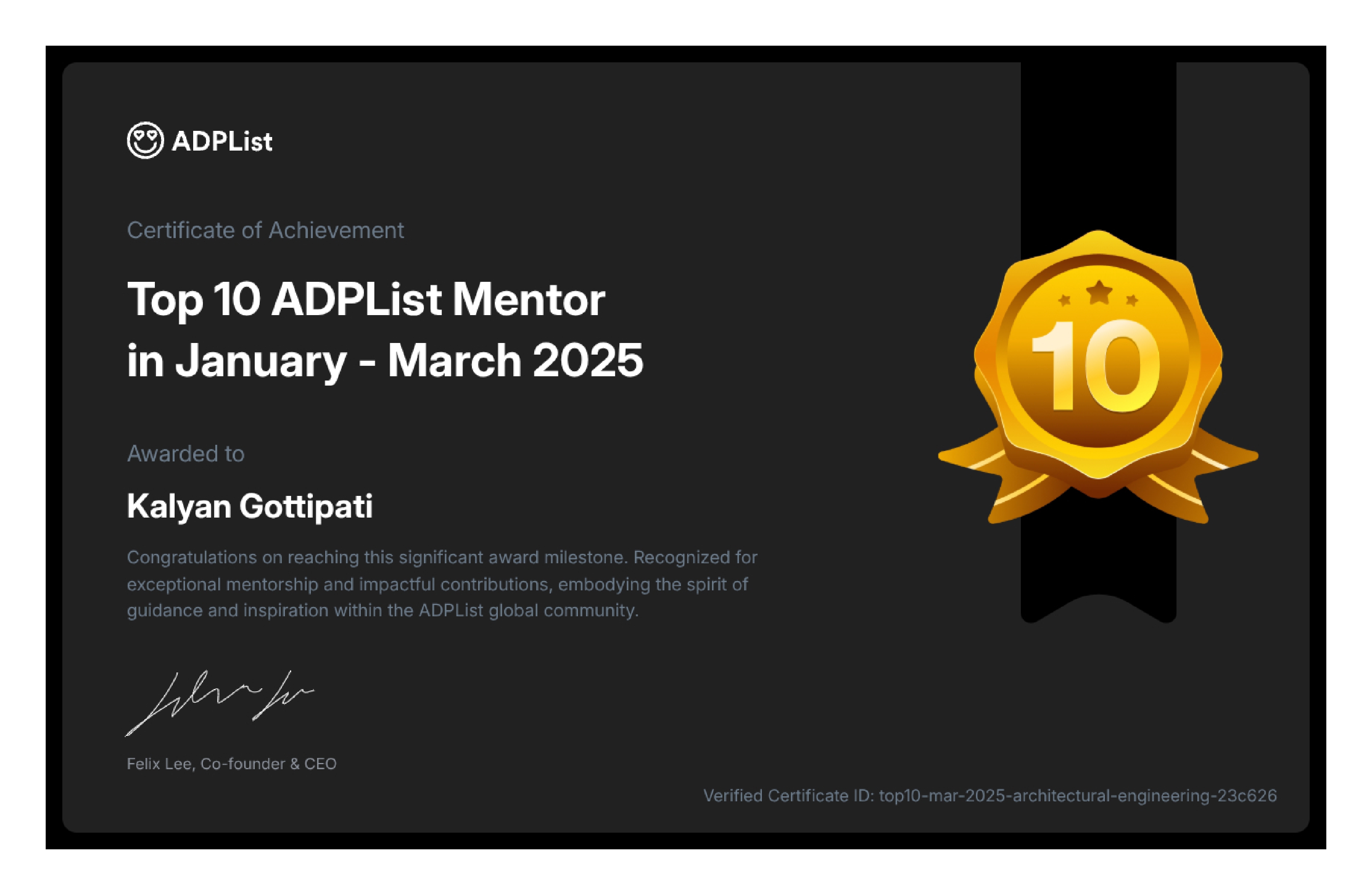 Details: As a top 10 mentor on ADPList.org, a leading free-to-use mentorship platform, I’ve mentored over 100 professionals and students from eight countries, including the U.S., India, UK, and Australia. My sessions cover career guidance, technical skill development, and project feedback in areas like cloud architecture, AI/ML, API security, and digital banking. I provide actionable advice on building scalable systems, securing APIs, and leveraging technologies like AWS, Java, and TensorFlow, drawing from my work on patented frameworks like the Dynamic UI Framework. My mentorship has helped mentees secure roles at top tech firms, launch innovative projects, and align with industry trends.