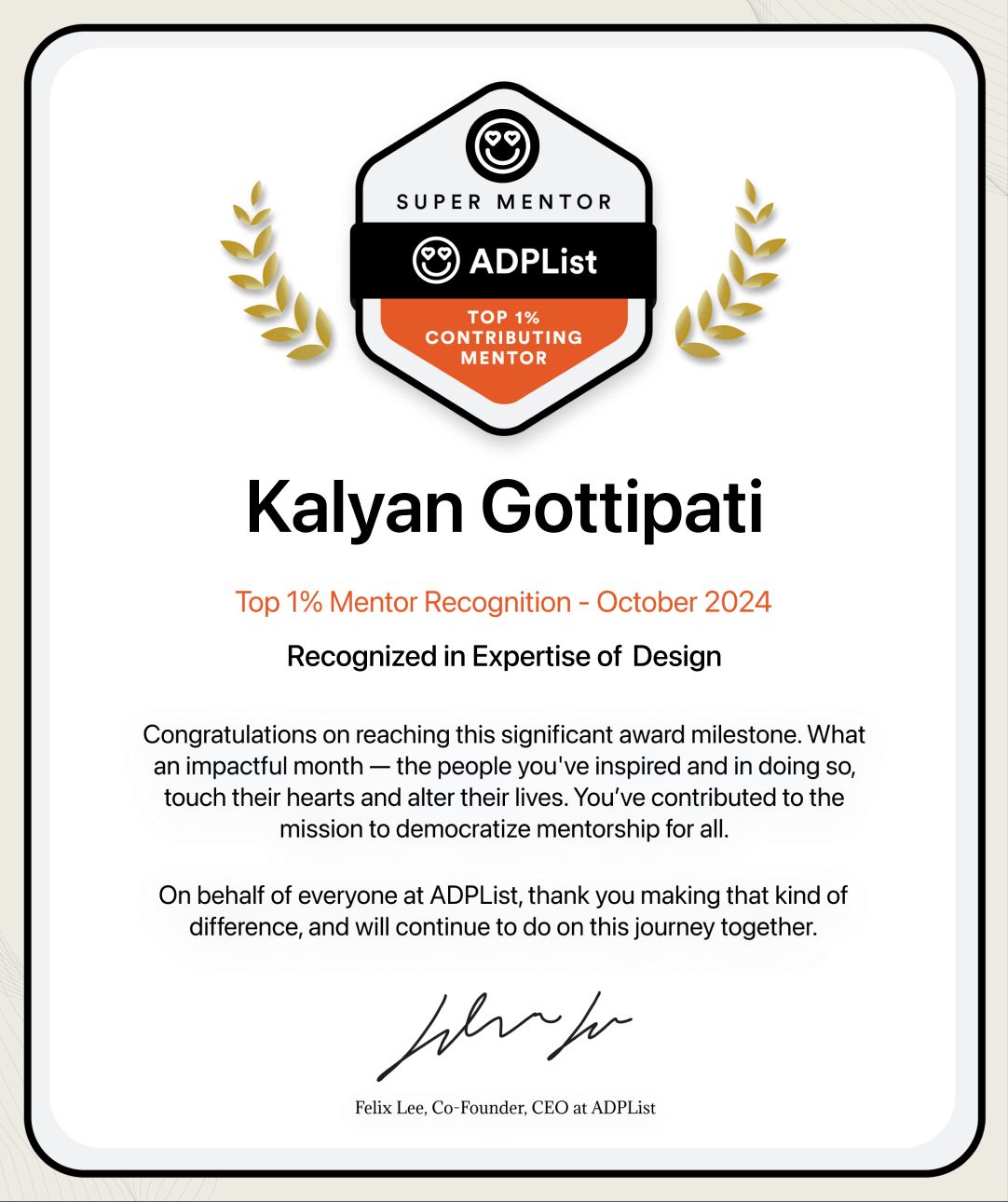 - Recognized by ADPList for impactful mentorship, earning a top 10 ranking and impact swag for contributions.